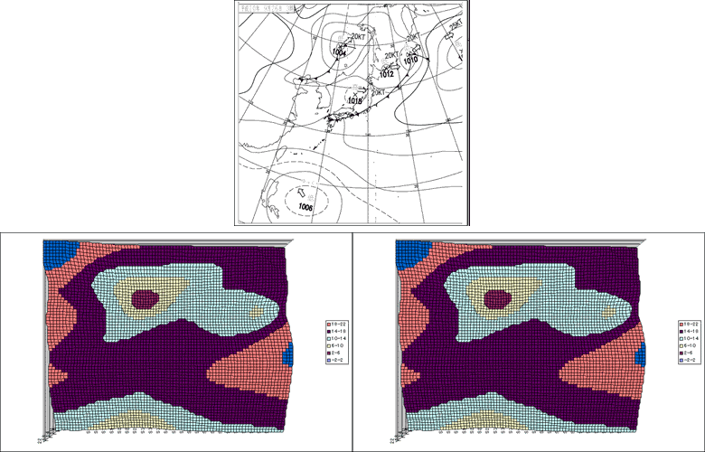 予測1の観測値は、日本とその周辺(アジア地域、西太平洋地域)の天気図画像を数値化したものである。データの大きさは80×64個、時間幅は3時間である。
