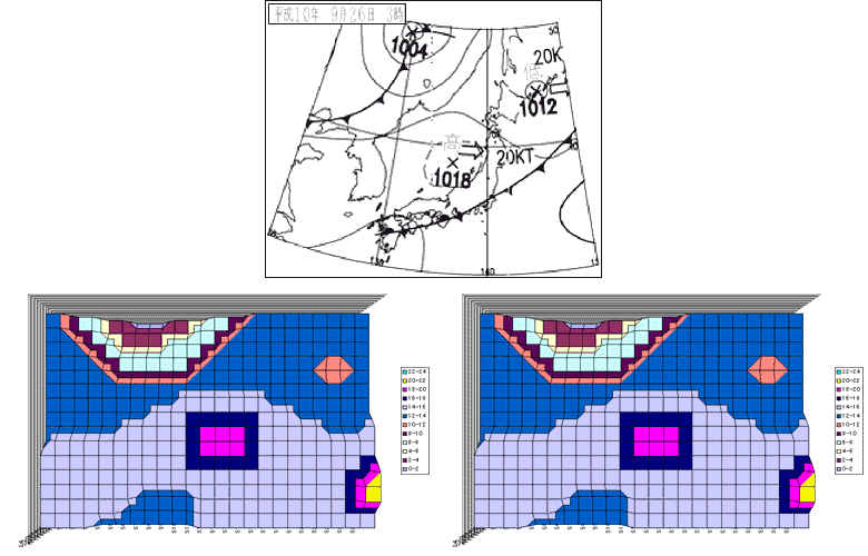 予測3の観測値は、3−1節と同時刻のデータを日本付近で粗く読みとったものである。データの大きさは24×16個、時間幅は3時間である。